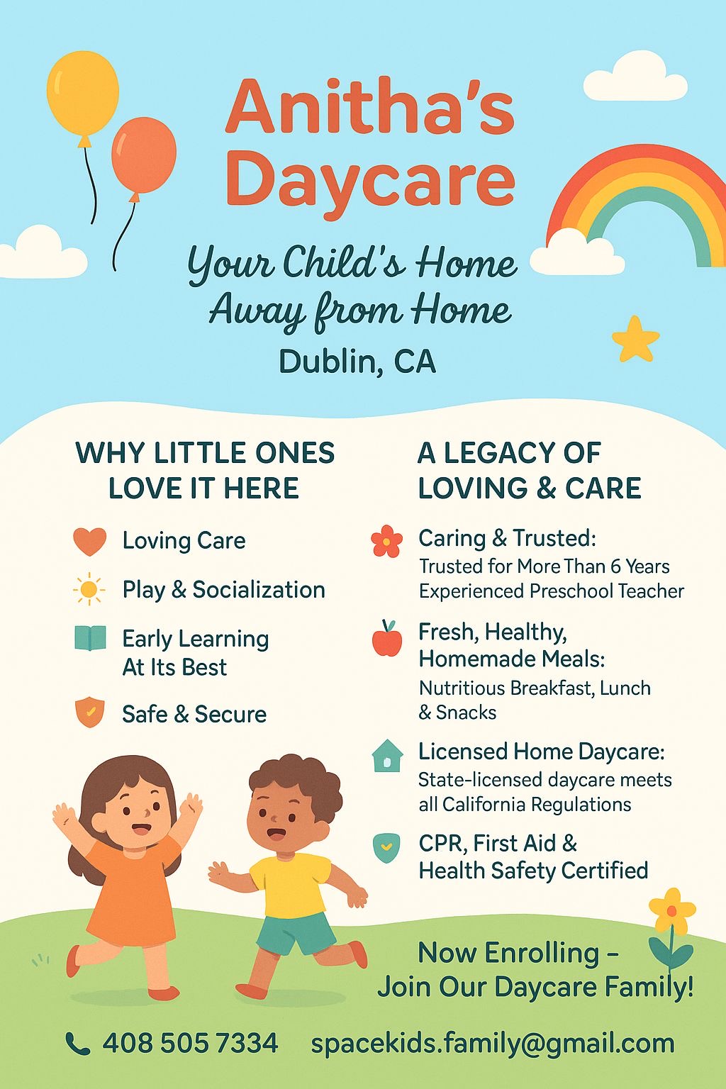 A friend of mine has started a new licensed home daycare in Dublin Ranch neighborhood. Currently, she is accepting children 2 years and above. She has completed 12 units in ECD (Early Childhood Development) and has a year and a half experience working with children in preschool. The home daycare is very clean and spacious. If you are interested, please call her at 408-907-7685 or email at spacekids.famil…@g…com