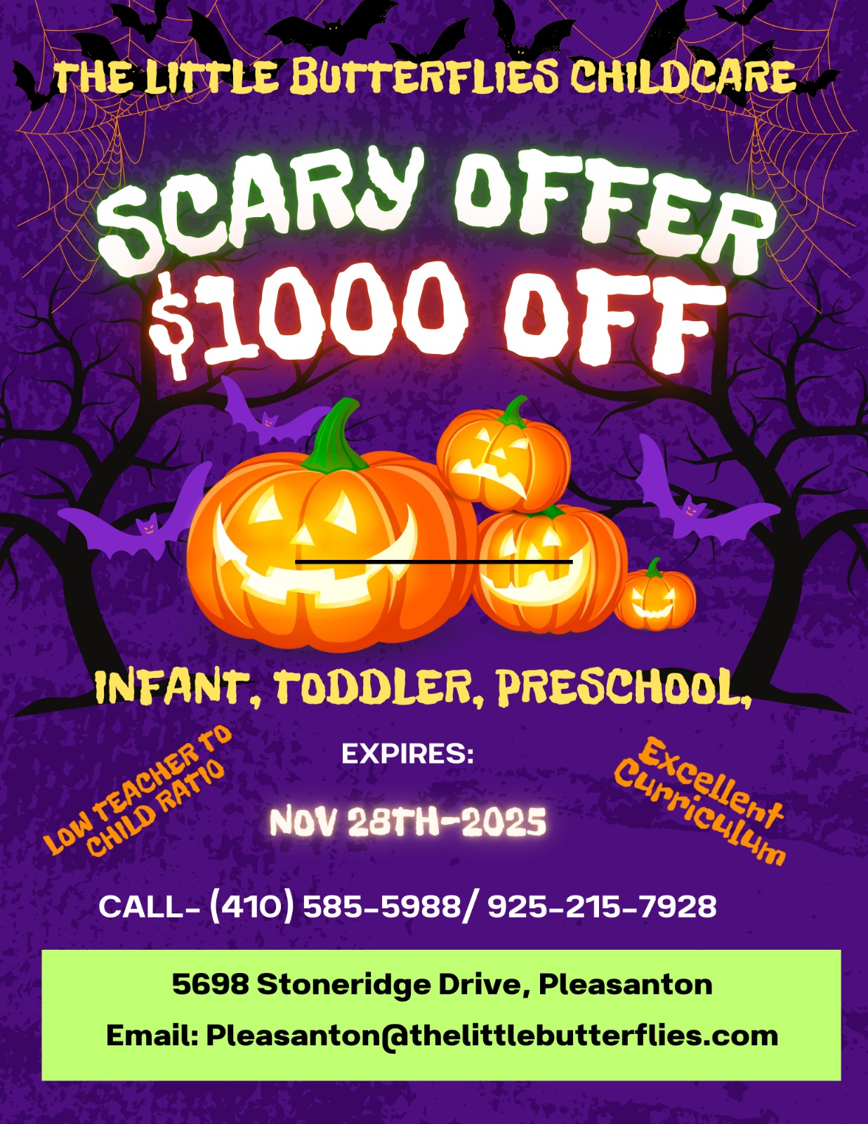 Amazing fall promotion. Call us for a quick tour and enjoy this amazing $1000 off on tuition fees. Email us at [email protected] or call us at 925-215-7928 for a quick tour